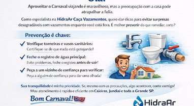 Olá! Aproveitar o Carnaval viajando é maravilhoso, mas a preocupação com a casa pode atrapalhar a folia. Como especialista na HidraAr Caça Vazamentos…